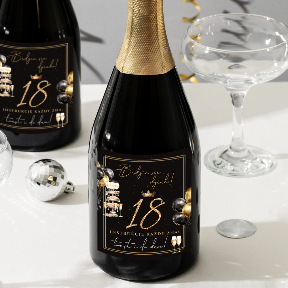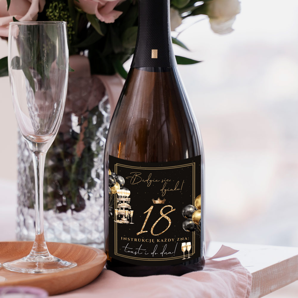 Stylowy, a’la brokatowy nadruk w złotym odcieniu na czarnym tle z motywem „18” i szampanu prezentuje się niezwykle elegancko. Etykiety świetnie współgrają z zaproszeniami oraz winietkami w naszej kolekcji czarno-złote, tworząc spójną i dopracowaną aranżację stołu.