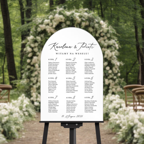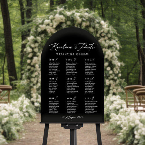 Plan stołów weselnych – wykonany z akrylu, pełni funkcję dekoracyjną i praktyczną, pomagając gościom łatwo odnaleźć swoje miejsce na Twoim weselu.