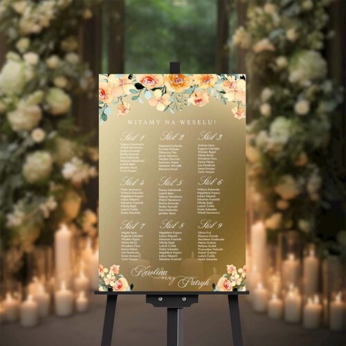 Plan stołów weselnych – wykonany z akrylu, pełni funkcję dekoracyjną i praktyczną, pomagając gościom łatwo odnaleźć swoje miejsce na Twoim weselu.