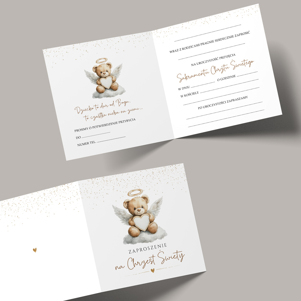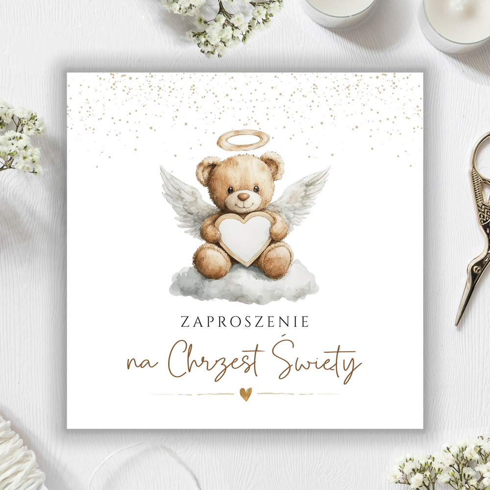 Zaproszenia na Chrzest Święty w białej kolorystyce, z pięknymi uroczystymi elementami, eleganckim a’la brokatowym nadrukiem z motywem misia aniołka. Do każdego zaproszenia dołożona jest biała koperta.