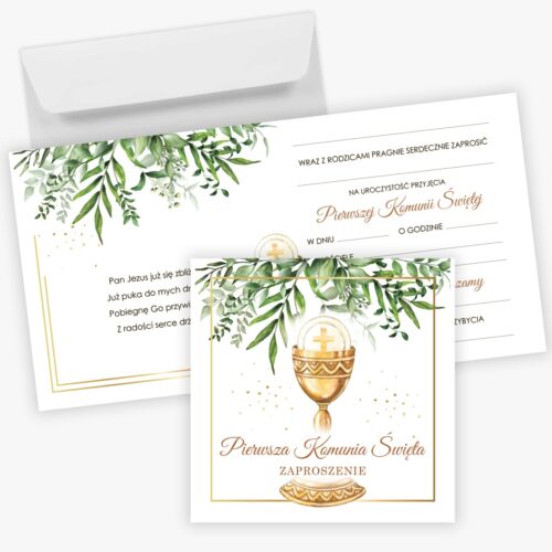 Zaproszenia na Komunię – składane kwadratowe zaproszenia w biało-zielonej kolorystyce, z pięknymi uroczystymi elementami, z grafiką złotego akwarelowego Kielichu Komunijnego i zielonymi elementami. Do każdego zaproszenia dołożona jest biała koperta.