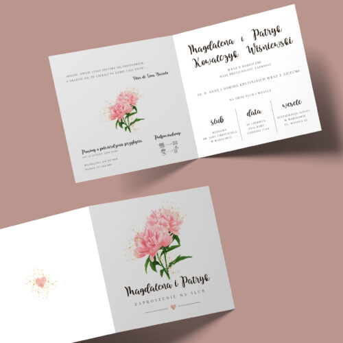 Zaproszenia na ślub – eleganckie składane kwadratowe zaproszenia. Wykonane na satynowym matowym papierze 300 gr/m2, z niezwykłą starannością i dbałością o szczegóły. Zaproszenia na ślub są w kształcie kwadratu, które otwierają się w formie karty, są maszynowo cięte i bigowane.