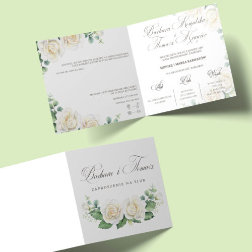 Zaproszenia na ślub – eleganckie składane kwadratowe zaproszenia. Wykonane na satynowym matowym papierze 300 gr/m2, z niezwykłą starannością i dbałością o szczegóły. Zaproszenia na ślub są w kształcie kwadratu, które otwierają się w formie karty, są maszynowo cięte i bigowane.