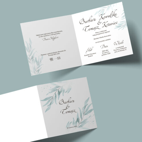 Zaproszenia na ślub – eleganckie składane kwadratowe zaproszenia. Wykonane na satynowym matowym papierze 300 gr/m2, z niezwykłą starannością i dbałością o szczegóły. Zaproszenia na ślub są w kształcie kwadratu, które otwierają się w formie karty, są maszynowo cięte i bigowane.
